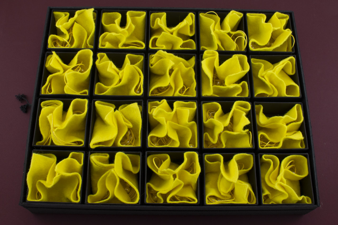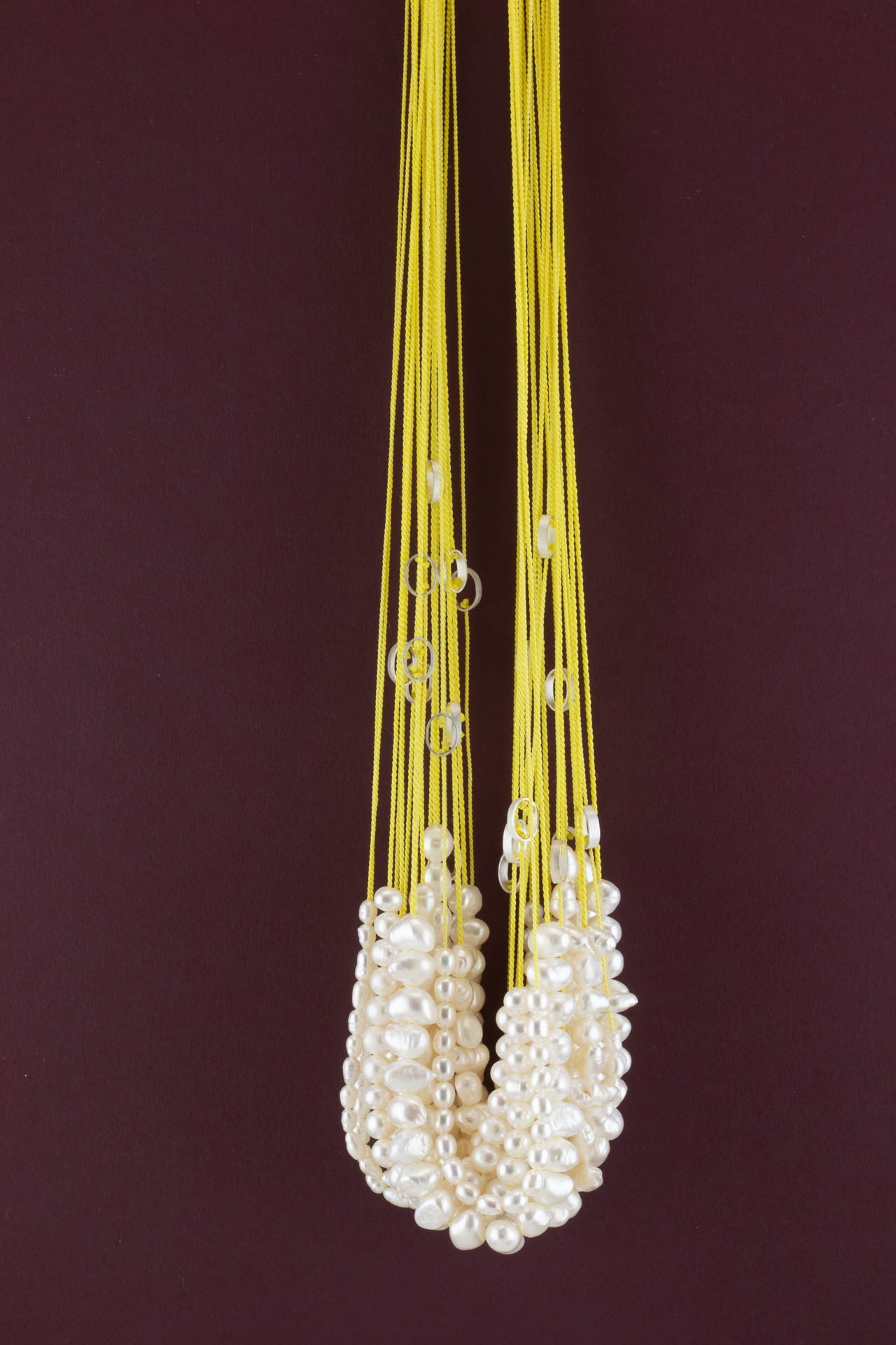 The necklace titled “20 x twenty x 20” consists of 20 pearl strings, tied together with a ribbon. The cords can be worn together or individually, and you can vary with numbers. The necklace comes in a box with 20 small boxes in which the jewelry can be stored.