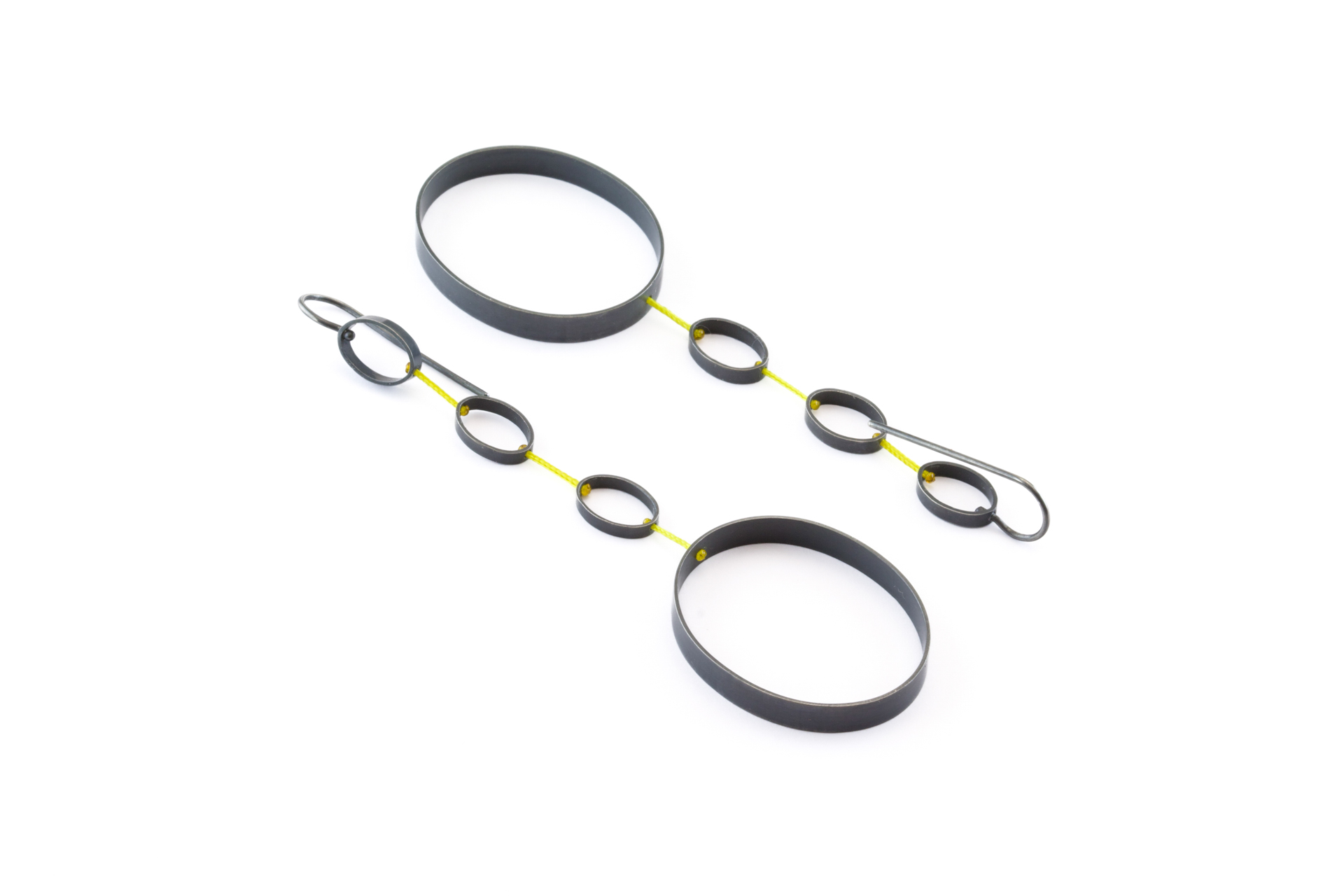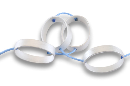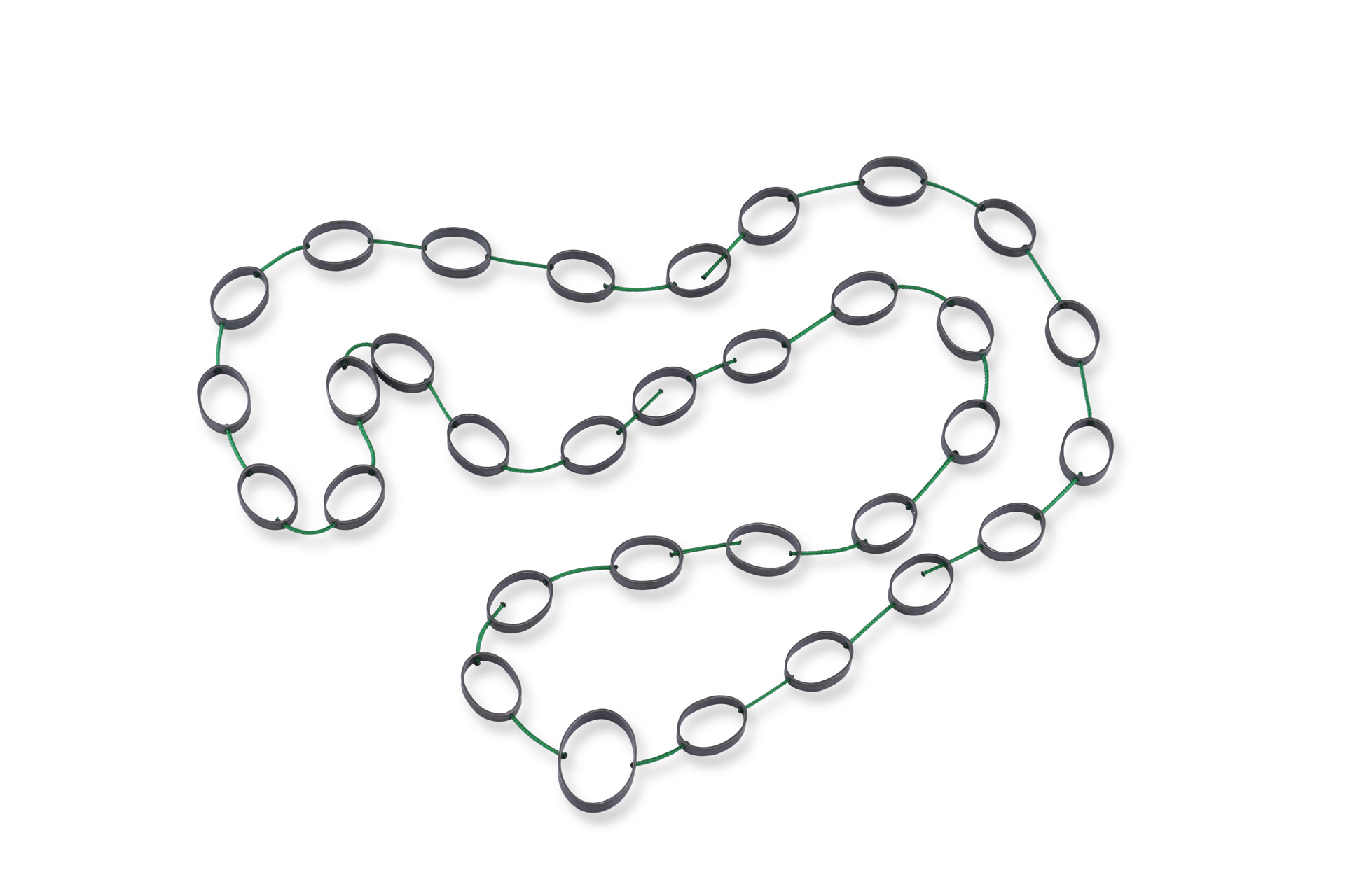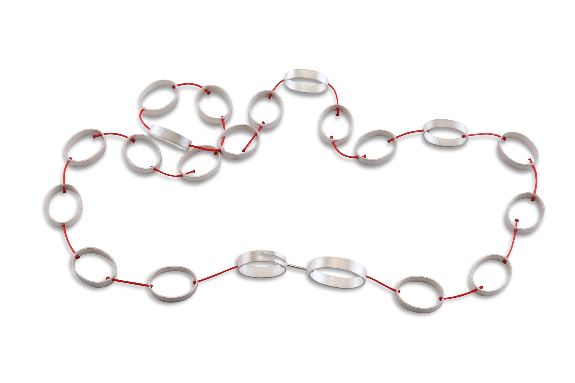 The jewelry pieces are made with a round silver tube as a base, sawn into rings using a lathe and scroll saw. The rings are bent into oval shapes with a tribolet tool. The larger ovals are made of silver sheet material. The rings are sanded, fitted with holes, then annealed and optionally oxidized. The ovals are connected by pieces of nylon cord, the ends of which are melted into balls. This technique makes the necklaces particularly strong and flexible and allows for movement with the body, just like the chains of the clock swaying in the wind.